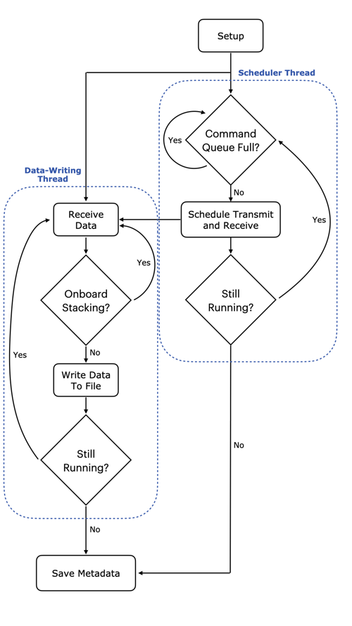 One thread is responsible for scheduling timed commands that are enqueued into FIFO queues within the SDR’s FPGA.