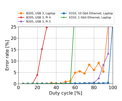 The maximum duty cycle you can achieve is a function of the SDR you use, the host computer, and the bandwidth you need. This page outlines suggestions for how to figure out an achievable duty cycle and what parameters can be tweaked to maximize this.