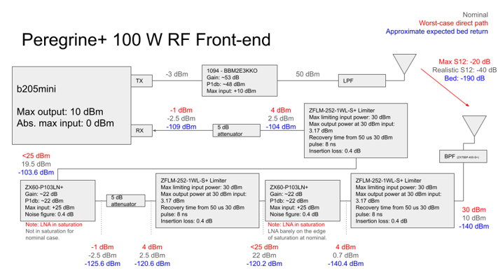 Block diagram of the RF components in the SORA RF frontend. Maximum power levels under three scenarios (nominal, worst-case, and an example expected bed return) are shown. The system is designed to be modular, so feel free to swap out as needed.